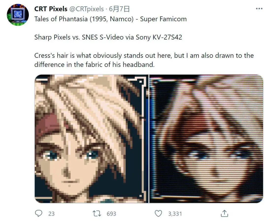 也许不是,Twitter 账号 CRT Pixel 将同一个游戏在分别液晶和 CRT 显示器上的画面拍摄下来做对比,在 CRT 显示器上,原本粗糙的像素画面变得更加光滑和清晰,不少玩家表示这才是熟悉的味道。